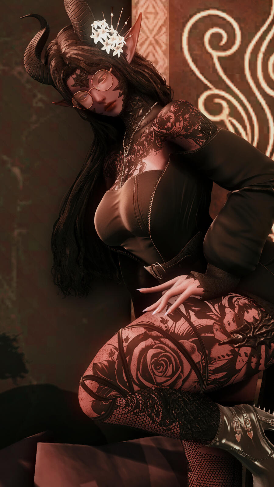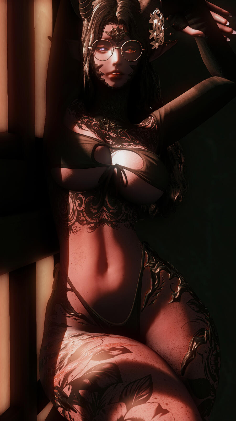 Presenting: FeminineMizuki is a strikingly beautiful Xaelan woman. Or so she appears. She has deep purple skin and startlingly black scales as well as black floral tattoos covering a large portion of her chest, back, arms and legs. What sets her apart from most Xaelans, are her long pointy ears and the horns that sit atop her head rather than astride her face. Typically Mizuki wears feminine clothing, often seen in tight fitting jeans and blouses, or fancy dresses, mini-skirts and low-cut tops. She is unafraid to flaunt her body, or dress in a provocative fashion should the occasion rise. Canonically speaking, she makes all of her own clothing, often not wearing the same thing twice.Her hair is black in color, and wavy in texture. Typically she wears it in a neatly crafted bun surrounded by a braid. A few loose strands of fringe to frame her delicate features. Occasionally, she'll wear it in other styles, but not often. She's grown her hair out in the last year, and rarely she'll wear it down.Following an incident that happened nearly two cycles ago, Mizuki has a large claw-like scar on her upper right thigh. Four long stripes that mar both flesh and scale alike and disrupts the nearly perfect appearance she had maintained thus far. Despite a years of time passing, it still looks in a state of only just healed.