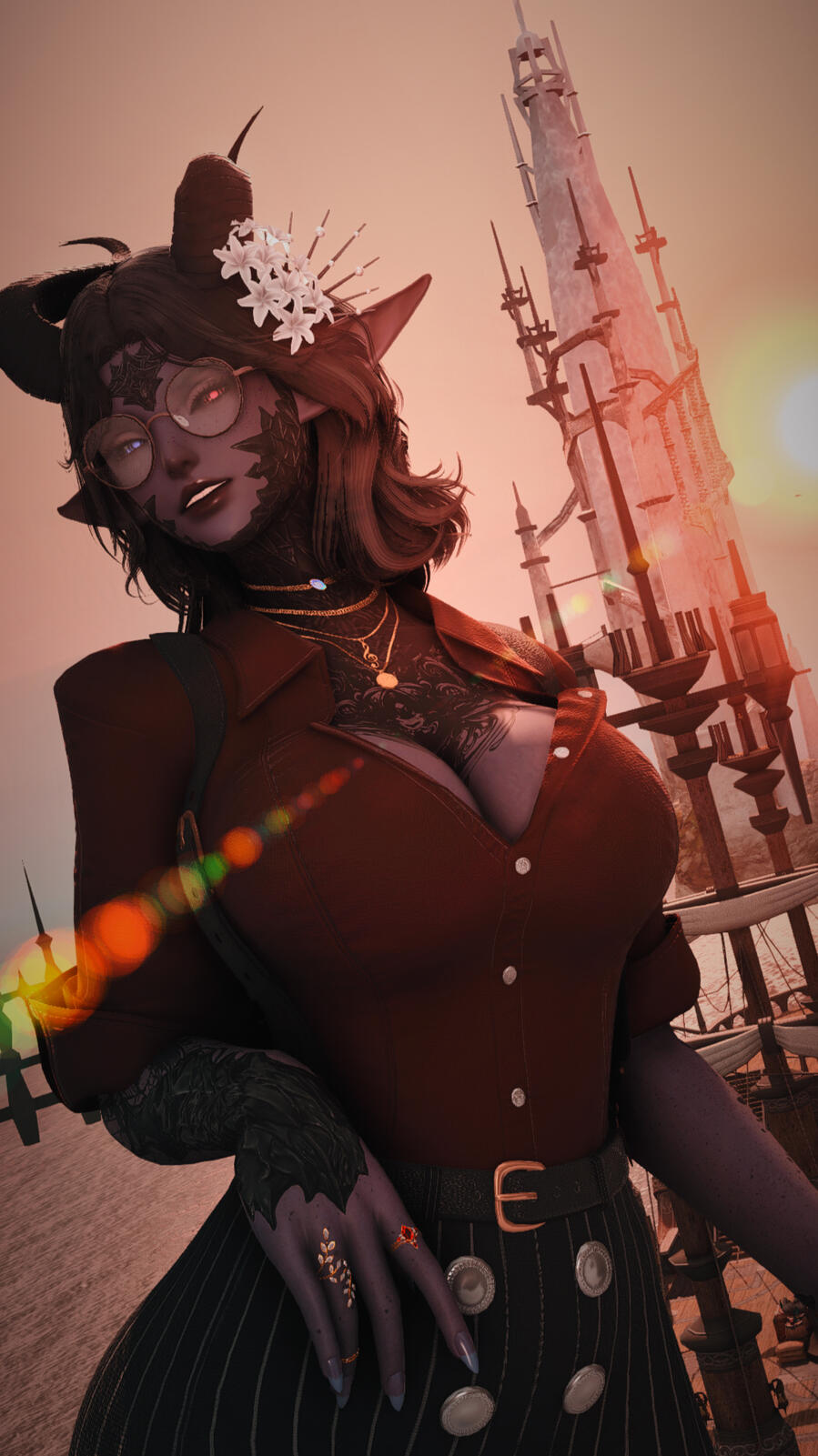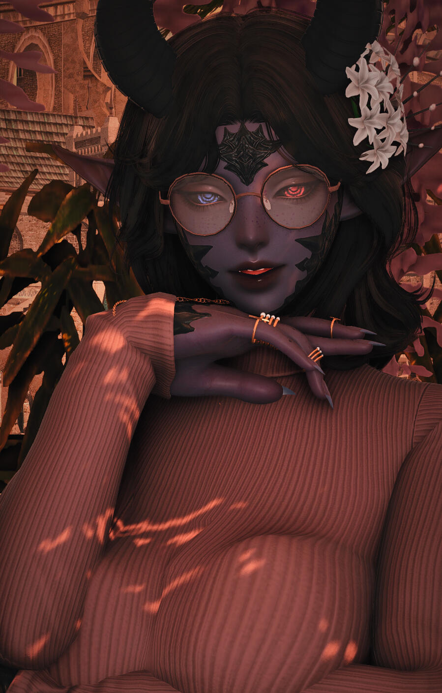 Mizuki is a stunning, seemingly Xaelic woman with deep purple skin and obsidian black scales. The pattern follows the typical Xaela, however her pointed ears and the horns that sit on top of her head set her apart from the rest of her kin. Suggesting only partial connection to the race occupying the Steppe. Her body is covered in an ornate, floral tattoo. From her blacked-out neck and shoulders, all the way down her sides and back to her legs and ankles. Its mostly decorative, but certainly a striking feature of hers. She is almost always impeccable dressed, designing almost all of her own wardrobe. Ensuring that each piece fits her curves perfectly.The Half-Xaela is enigmatic, inquisitive, highly ambitious, and a bit nosey. She enjoys a great many things in this life, but the only thing that she holds to be the most important aspect of her life? Above even personal relationships, her titles, or even her new business - is knowledge. She will go to any lengths necessary in order to achieve whatever thread of knowledge she has her eyes set upon. Even if it means crossing the line of some's moral compass.Knowledge is everything.